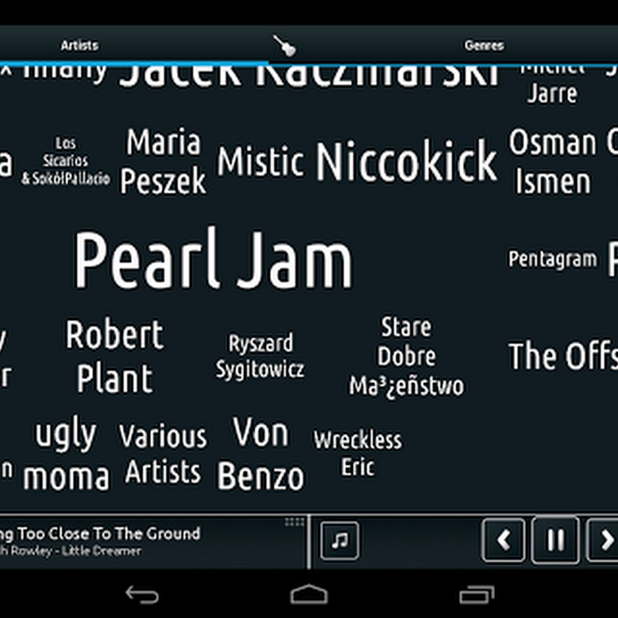1. n7 player:- It is a very cool and attractive music player and definitely different from others it like other music players not displays the list of the song and choose from them but what it does that it displays names of all artists and genres like a collage and you tap on the name and it will show the album and then choose any song from that album and also it provides the option at the beginning to download missing artwork so it has dual benefits ( i )You can get the missing artwork ( i i ) You can get a cool music player.